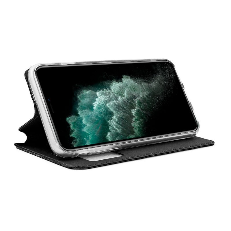 Apertura lateral tipo libro. Incorpora una carcasa específica del modelo de smartphone, para incrustarlo y dejarlo perfectamente encajado.